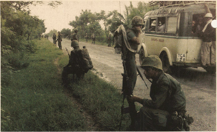 A Marine patrol moves up a local highway, passed by a civilian bus. In accordance with General Westmoreland's